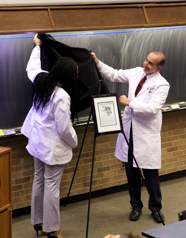 Executive Dean John Zubialde, M.D., and medical student Melissa Onyekuru unveil a plaque in honor Dr. Rebecca Lee Crumpler, the first African-American woman in the United States to earn a medical degree.