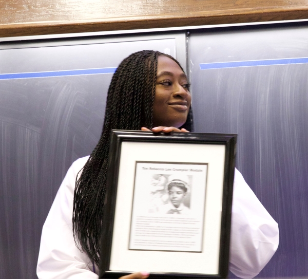 OU College of Medicine student Melissa Onyekuru holds a plaque in honor of Dr. Rebecca Lee Crumpler, the first African-American woman in the United States to earn a medical degree.