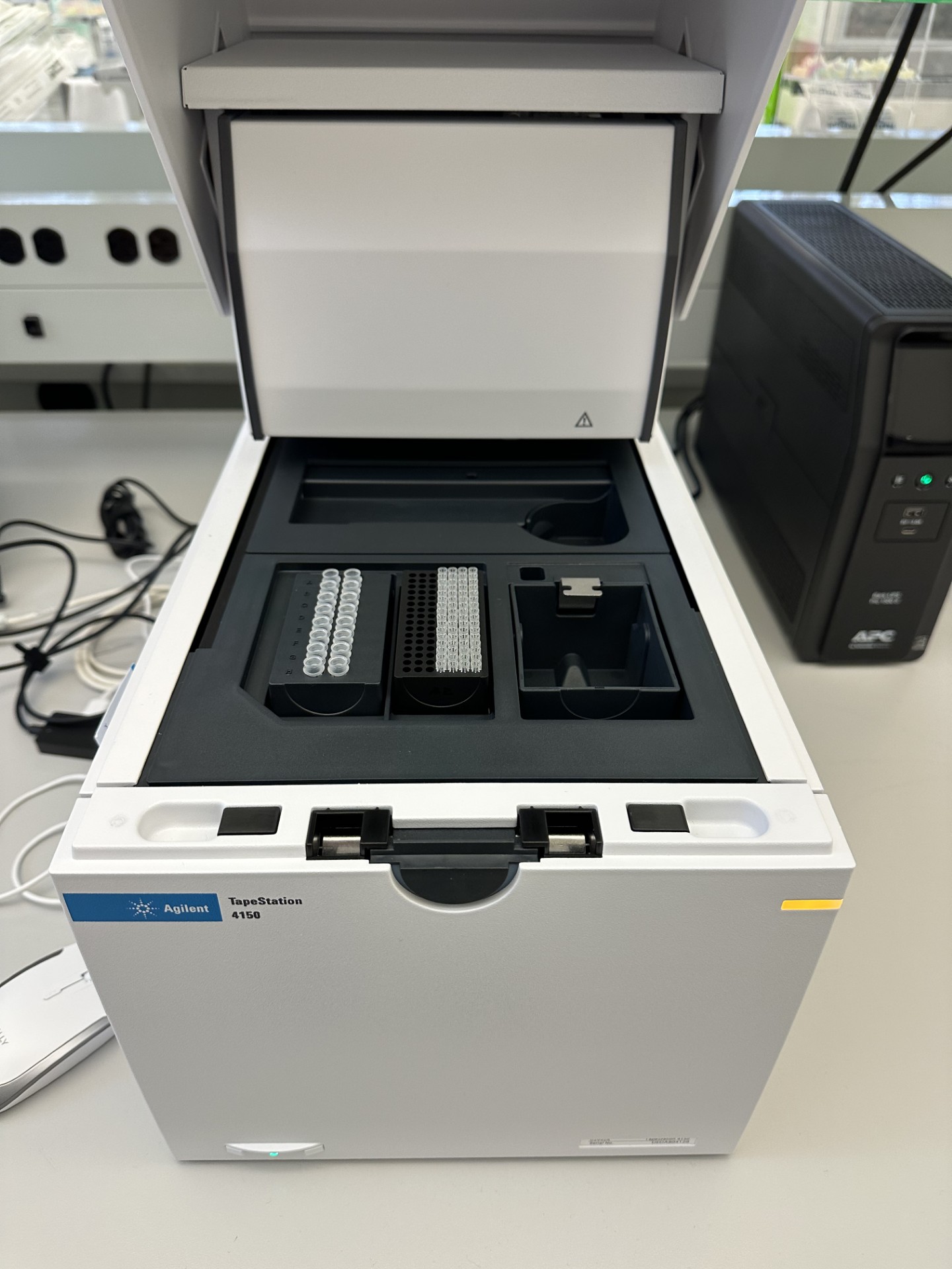 Agilent's TapeStation 4150 and Bioanalyzer 2100 are automated electrophoresis tools used for checking the the size, quantitaion, and quality of DNA and RNA. The tapes available are for DNA, HS DNA, HS DNA 5000, RNA, and HS RNA. Small RNA can be run on Bioanalyzer chips. ThermoScientific's NanoDrop One is a microvolume spectrophotomer with the ability to detect contamination.